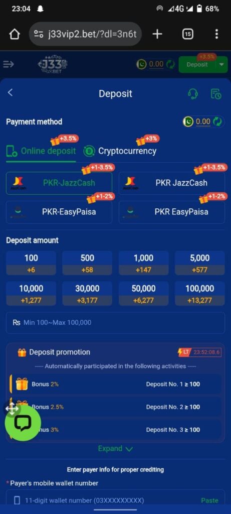 J33 Game supports common payment methods used in Pakistan. The minimum deposit amount is kept low so beginners can start easily. For example, if you deposit a small amount, your balance updates instantly in the app wallet. Deposit screenshot is given below.